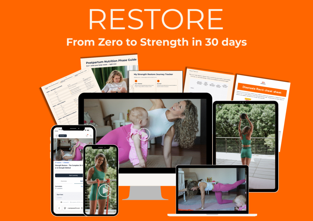 The bridge between postpartum rehab and strength training. RESTORE starts from your postpartum clearance (or earlier) and builds week by week until you’re ready to lift, run, and feel like yourself again. Designed for both vaginal and C-section births.